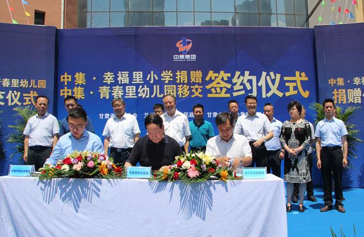 2017年6月22日下午14時,甘肅中集實業(yè)集團有限公司通過甘肅省慈善總會,向蘭州市安寧區(qū)人民政府捐贈價值1.02億元中集•幸福里小學(xué)暨中集•青春里配建幼兒園移交儀式在中集•幸福里小學(xué)操場隆重舉行。甘肅省原人大常委會副主任、甘肅省慈善總會會長朱志良,甘肅省原民政廳黨組書記、廳長、甘肅省慈善總會常務(wù)副會長梁國安,甘肅省教育廳副廳長趙 凱,蘭州市人大常委會副主任孫曉鋼,蘭州市人民政府副秘書長淡漢榮,安寧區(qū)區(qū)委書記王 方及安寧區(qū)區(qū)委副書記、區(qū)長雒澤民攜安寧區(qū)委、區(qū)人大、區(qū)政府、區(qū)政協(xié)四大班子領(lǐng)導(dǎo),蘭州市教育局、蘭州市國土局、蘭州市規(guī)劃局、蘭州市房產(chǎn)局相關(guān)領(lǐng)導(dǎo)出席捐贈儀式,甘肅中集實業(yè)集團有限公司黨委書記、董事長周啟濤代表公司完成與安寧區(qū)人民政府捐贈及移交簽約。